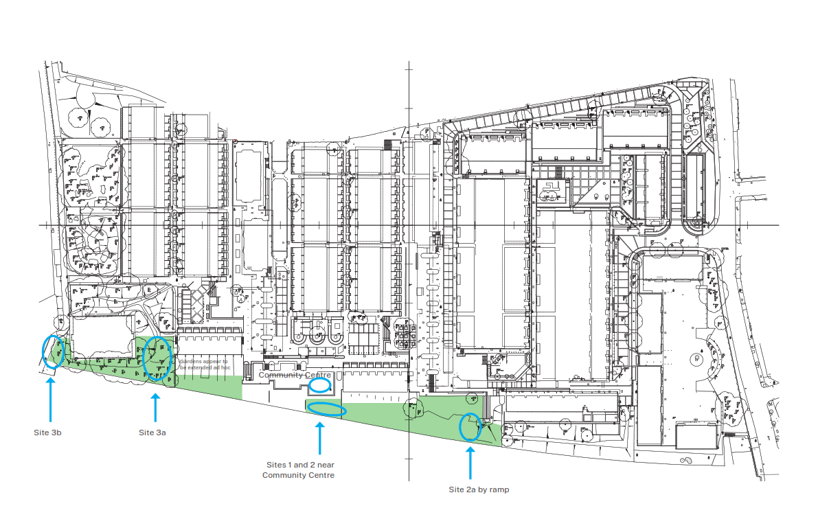 The brief, led by M&E engineers Max Fordham, required us to design the enclosures and ancillary structures to house nine air source heat pumps, a plant room, an LV switch room, and a new UKPN substation. The site sits in the southern corner of Agar Grove Open Space, tucked against the boundary wall that separates the estate from the Mildmay overground line. Positioning here exploits the natural fall in ground level: the enclosure sits at a lower datum than the surrounding landscape, keeping its apparent height well below the existing railings when viewed from residents' balconies.
