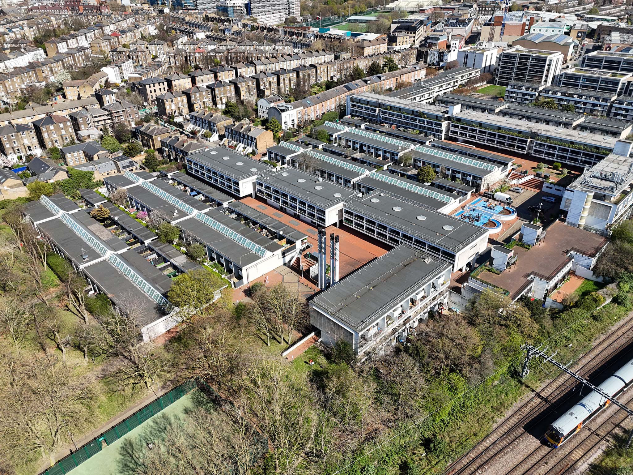 In close collaboration with Max Fordham we are working with Camden to decarbonise The Maiden Lane Estate. Built by Benson & Forsyth between 1976 and 1983, the estate is now a locally listed heritage asset in Camden. Its district heating network has reached the end of its design life, with frequent failures leaving residents without reliable heat. This project delivers the infrastructure for a full transition from natural gas to air source heat pumps, providing low-carbon space heating and hot water to the whole estate, and directly supporting Camden's commitment to reach net zero by 2030.