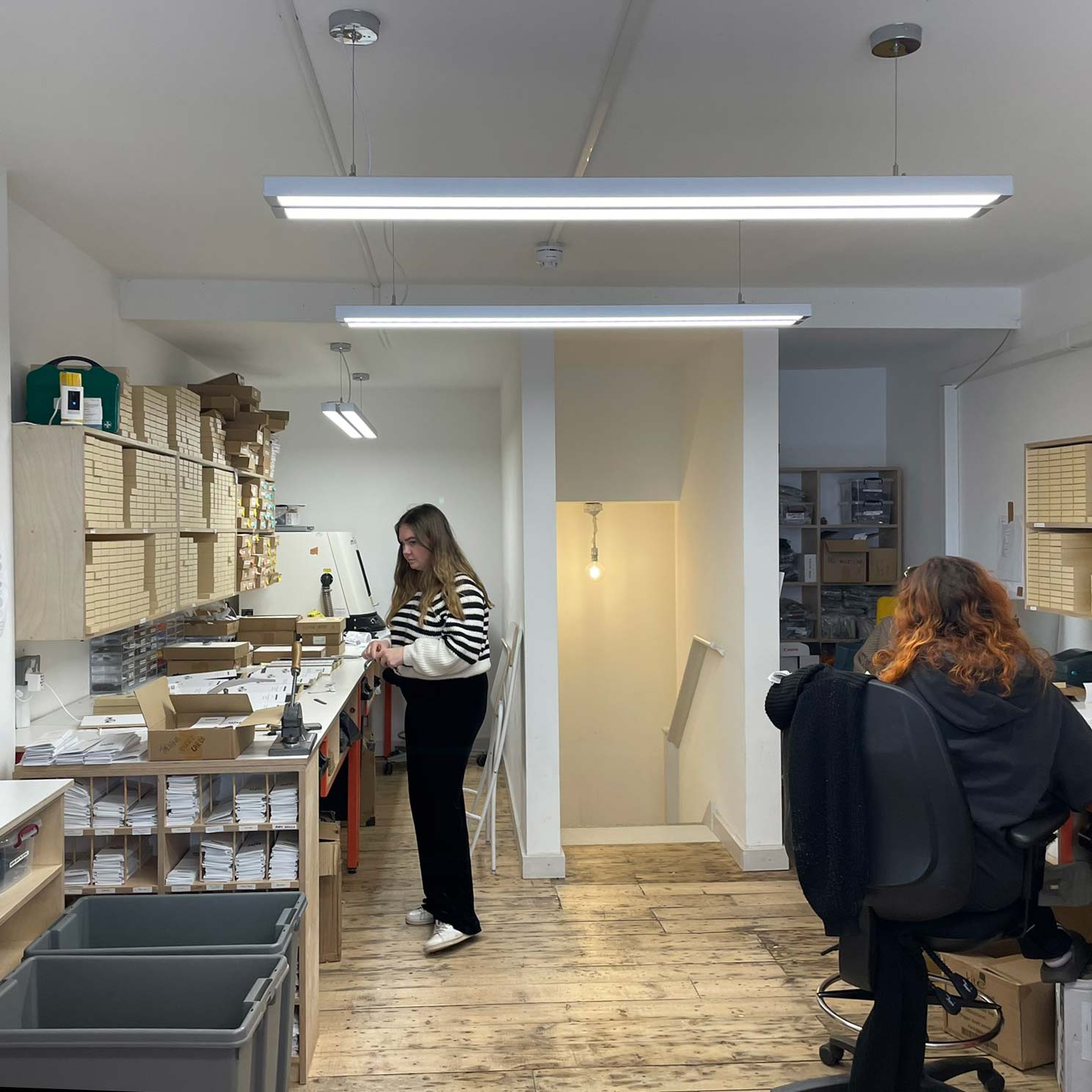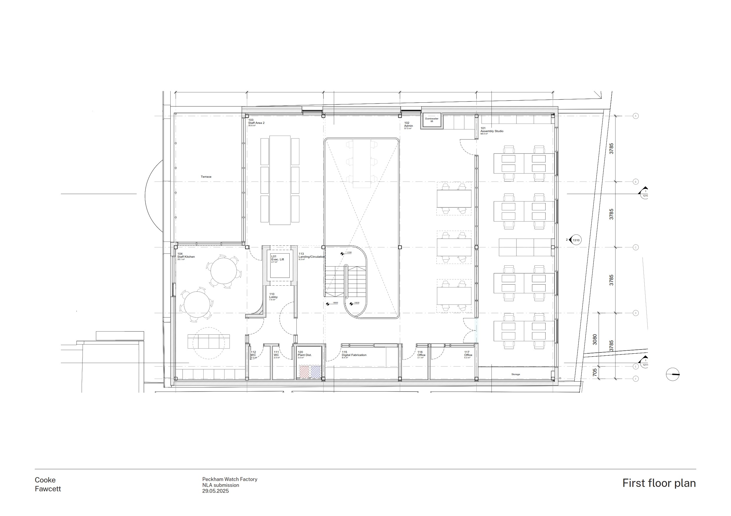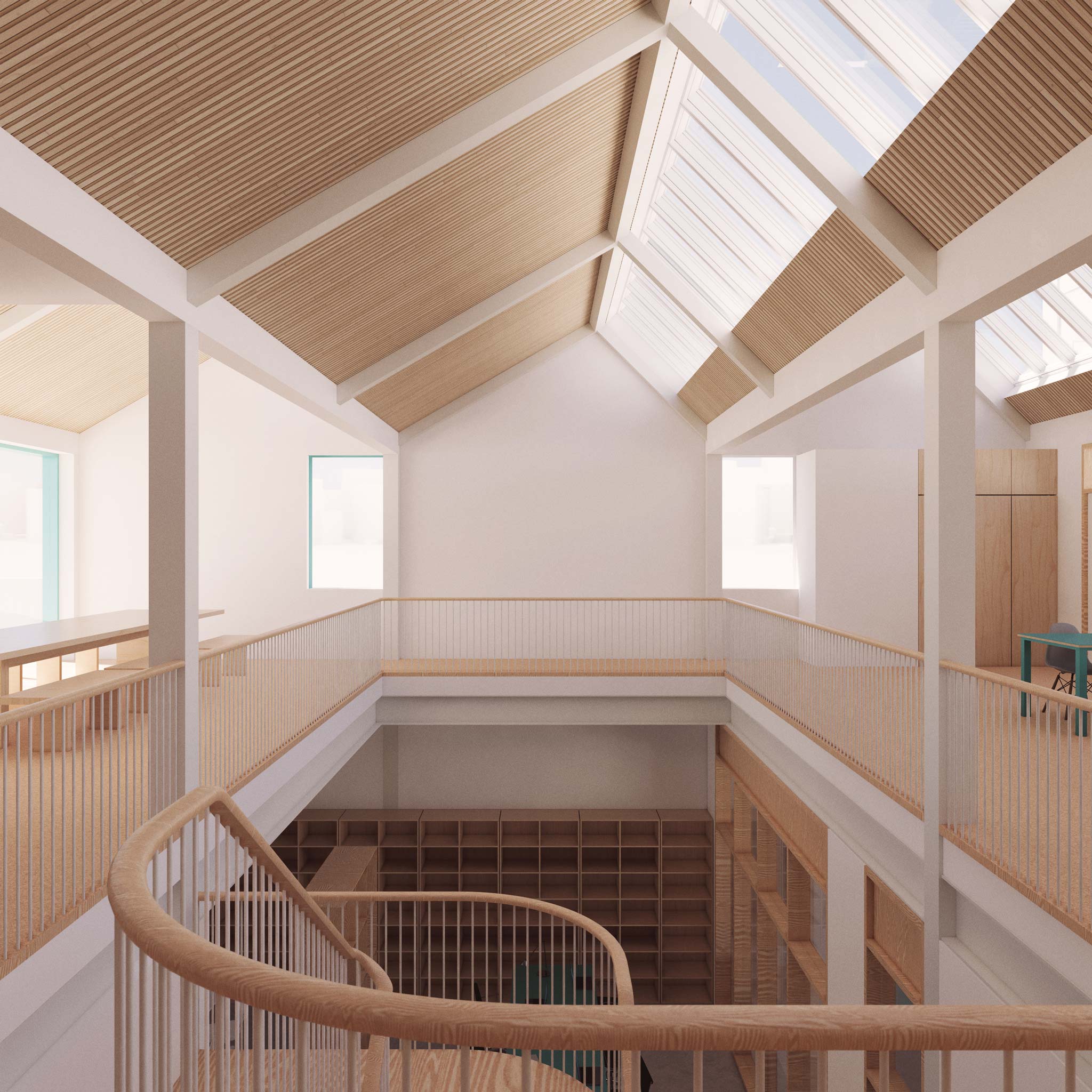 The workspace is anchored around a central atrium that brings natural light deep into the building and creates visual connections between production areas. At ground level, print workshops and preparation spaces benefit from controlled north light through a new northern lightwell, while customer service areas are positioned at the south end for easy access to the service yard. The upper floor houses the assembly studio, requiring exceptional daylight quality for intricate work, alongside administrative spaces and staff amenities including a south-facing terrace.