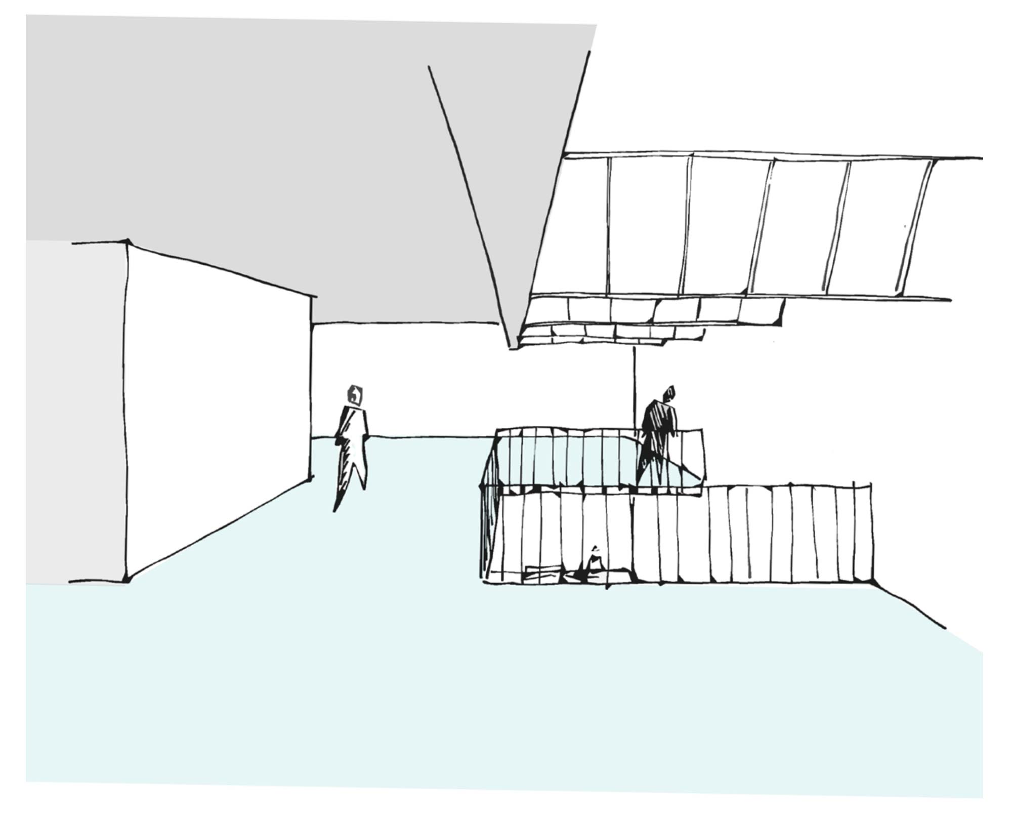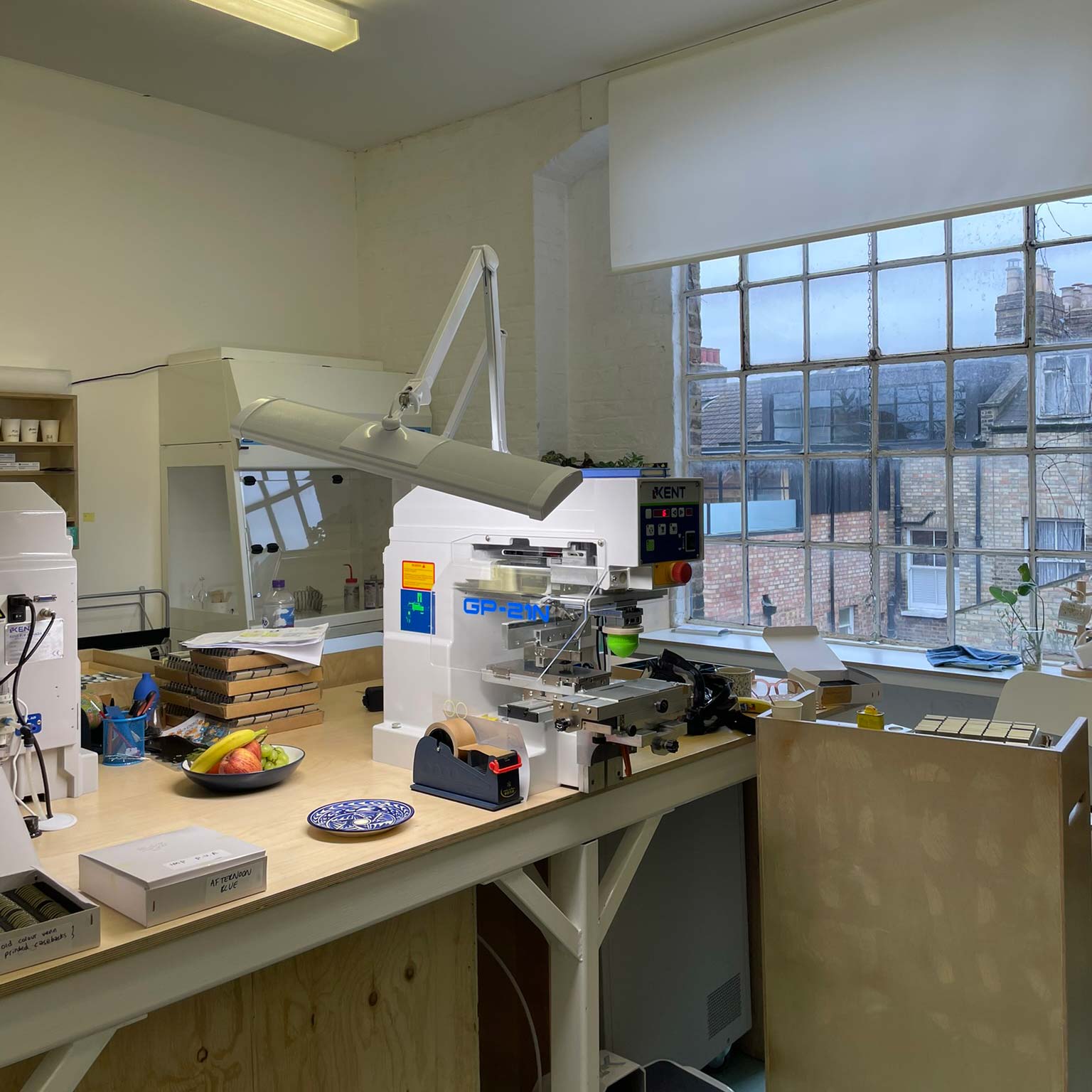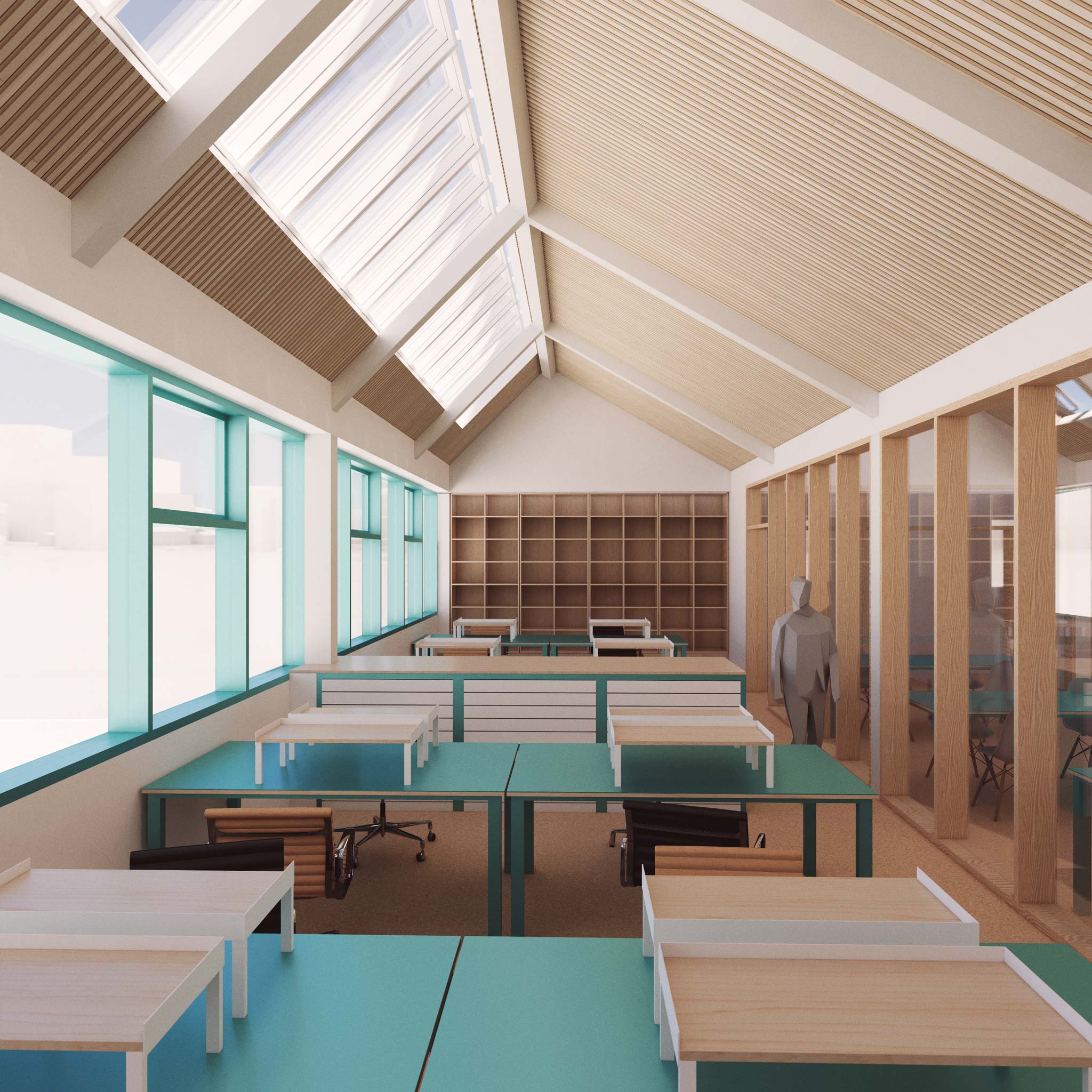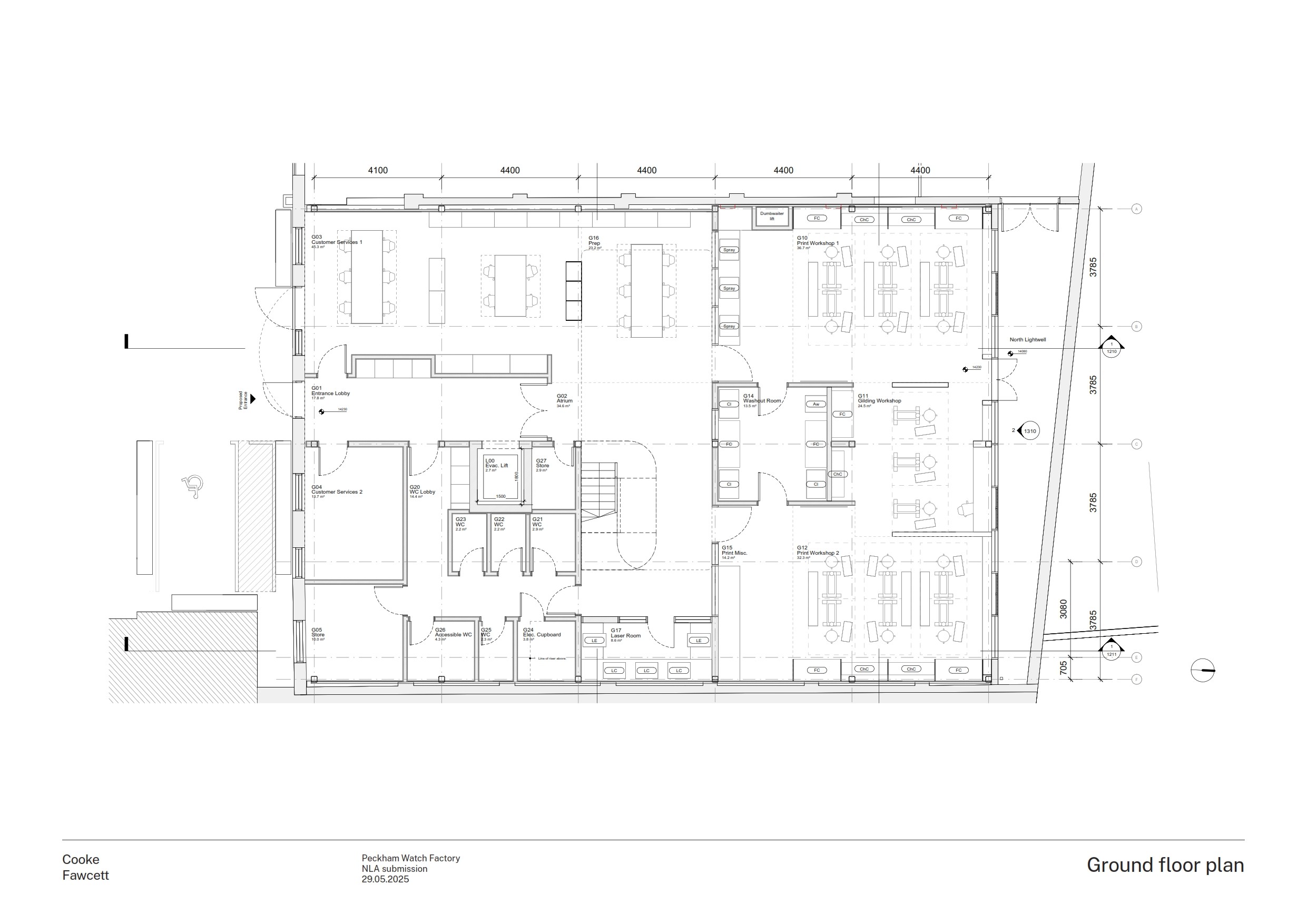 The workspace is anchored around a central atrium that brings natural light deep into the building and creates visual connections between production areas. At ground level, print workshops and preparation spaces benefit from controlled north light through a new northern lightwell, while customer service areas are positioned at the south end for easy access to the service yard. The upper floor houses the assembly studio, requiring exceptional daylight quality for intricate work, alongside administrative spaces and staff amenities including a south-facing terrace.