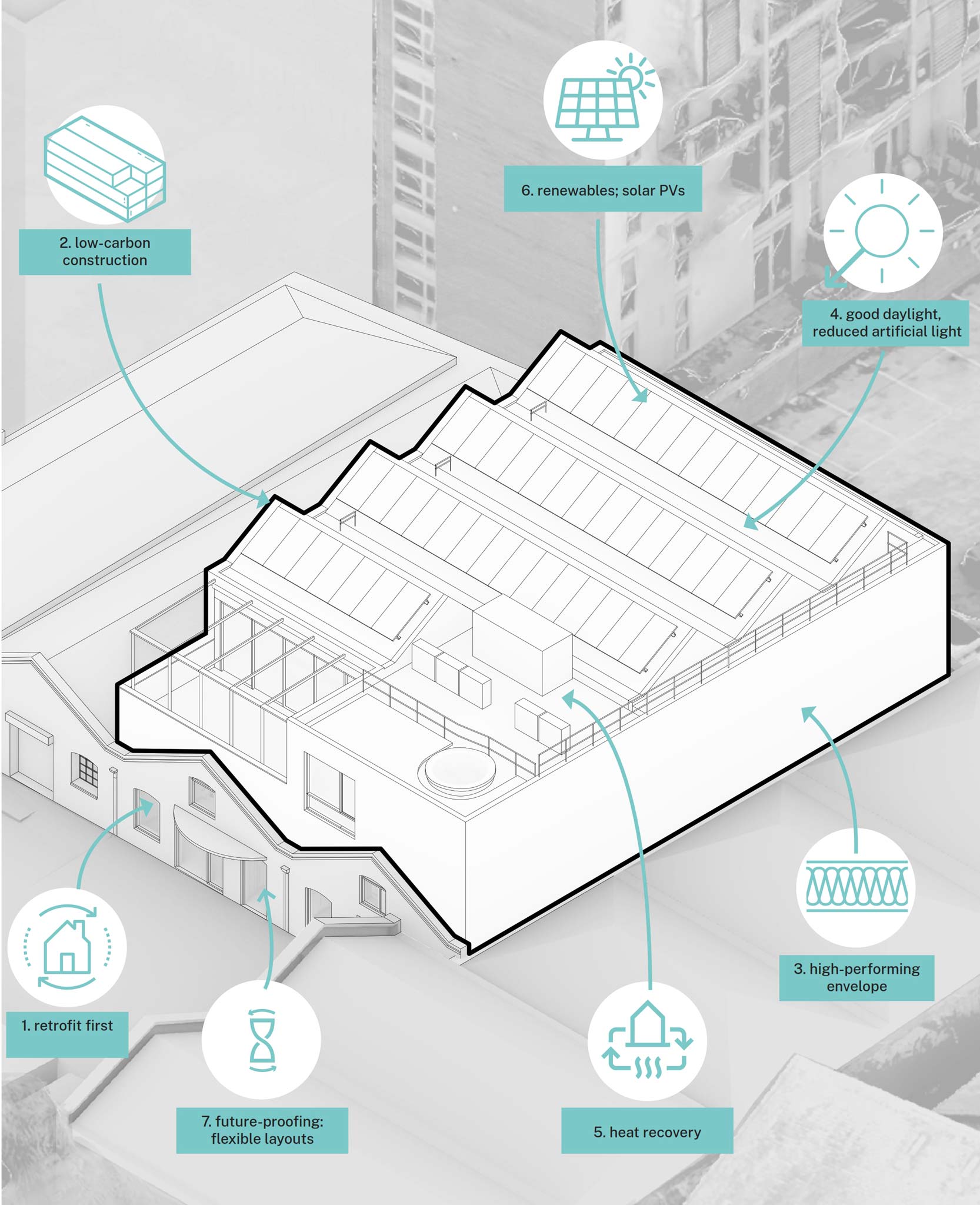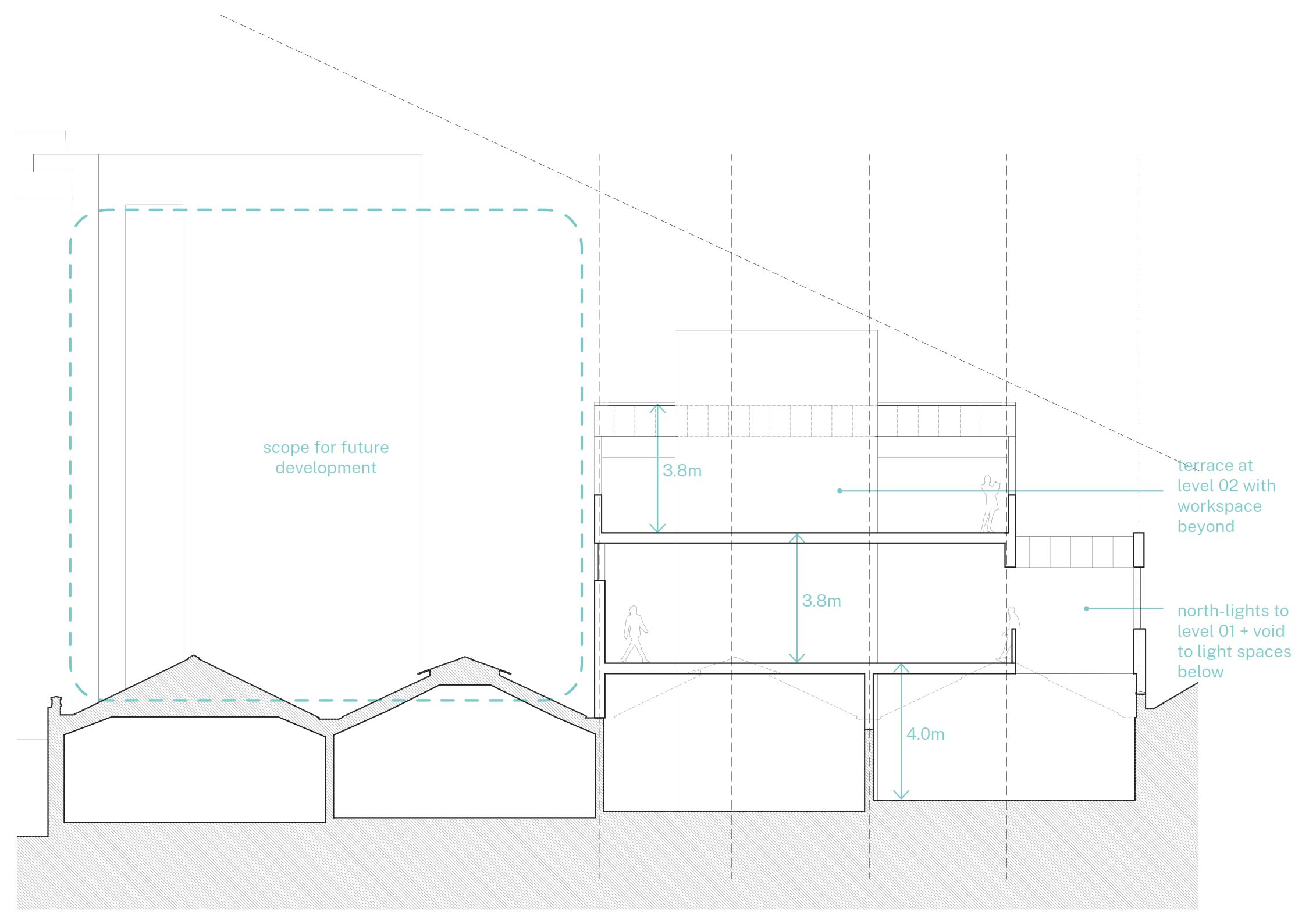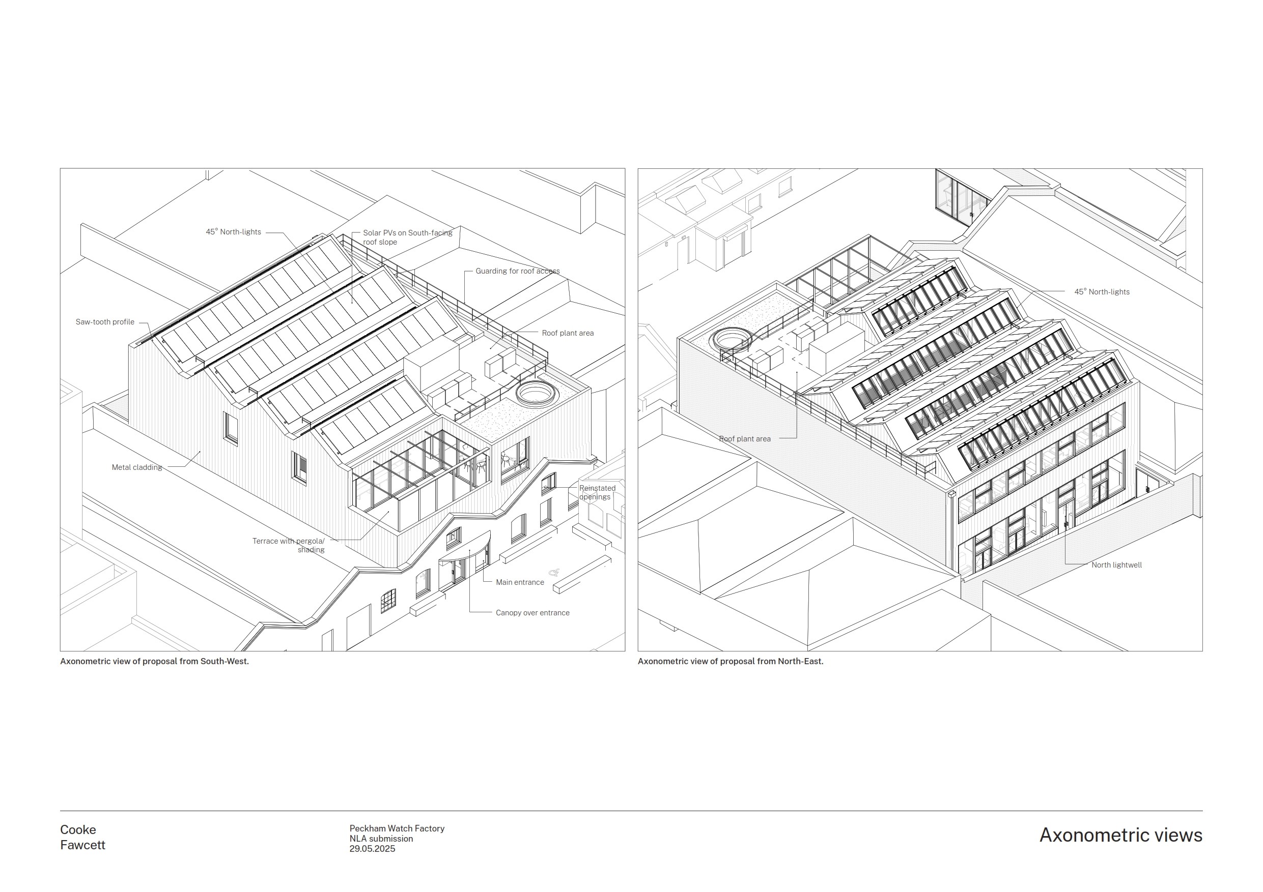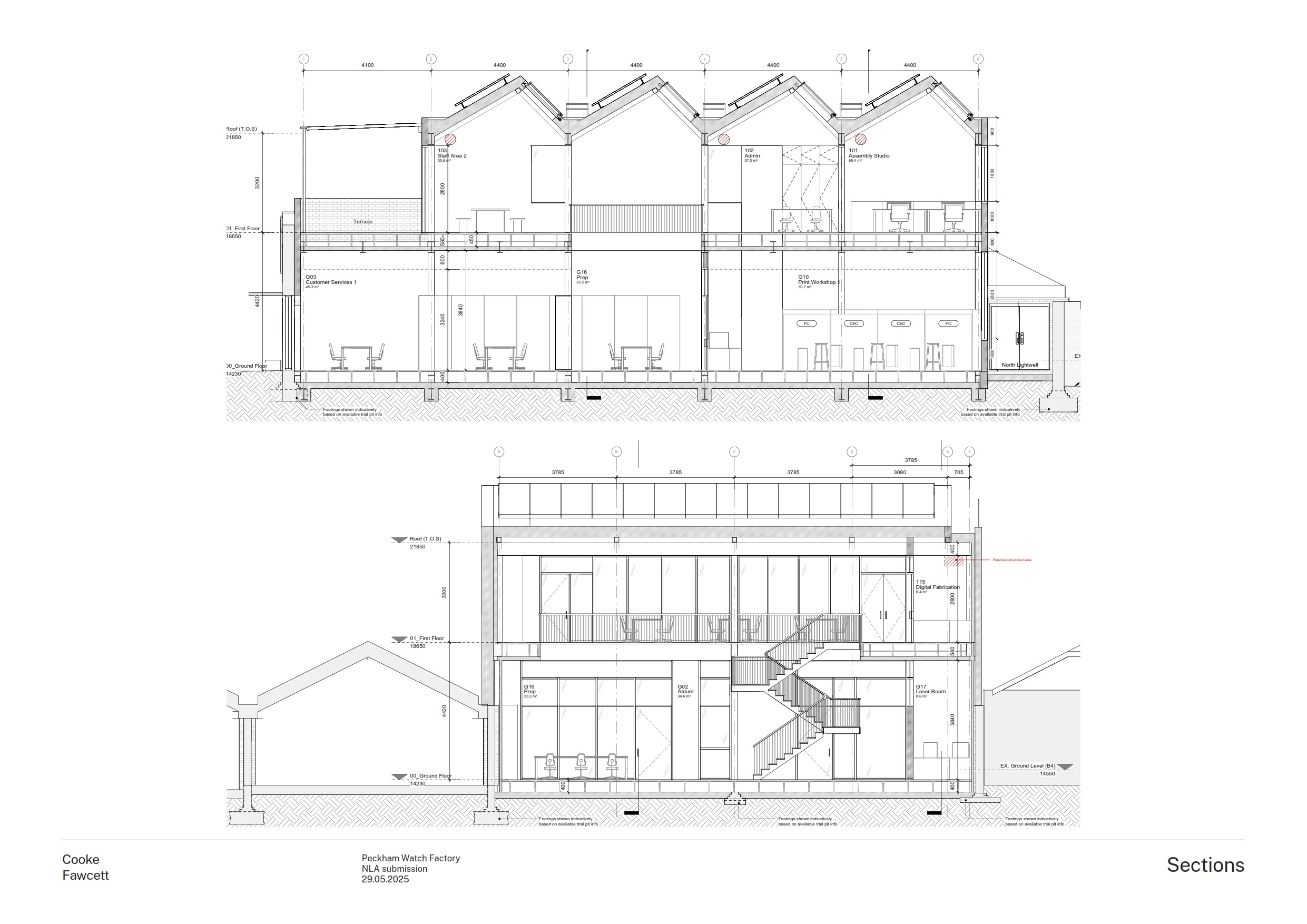 The building's distinctive form is defined by a saw-tooth roof profile with north-facing glazing, designed to provide optimal indirect daylight for detailed manufacturing work while preventing glare—essential for precision fabrication that requires consistent, high-quality illumination. This profile references the industrial heritage of Peckham while creating a contemporary interpretation suited to modern manufacturing.