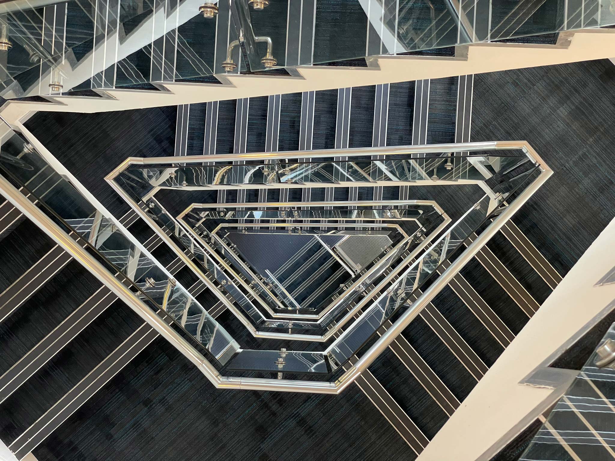 We ran design studies exploring how the exterior could inform the new interior. The existing façade has this distinct 1980s quality—brick, precast concrete, Aztec-style columns—and rather than pretending that doesn't exist, we leaned into it. Mood boards embraced that period character, which helped the client understand the direction. The material palette developed from there: terrazzo, red travertine, timber linings in the lobby and lifts. The existing triangular stair becomes a visual marker, highlighted in bold colour and strategically lit to draw attention from the busy intersection outside.