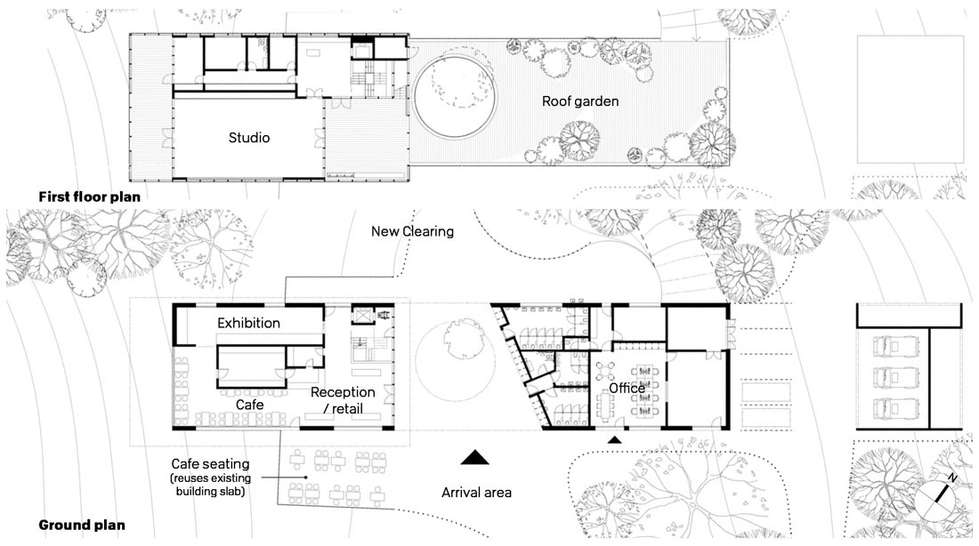 The proposal acts as a gateway to the nature reserve, allowing clear orientation and access to the facilities as visitors arrive from landscaped parking through a welcoming opening in the ground-floor building. Walking routes, educational tours, picnic areas and play spaces are directly reached from the area adjacent to the new building.