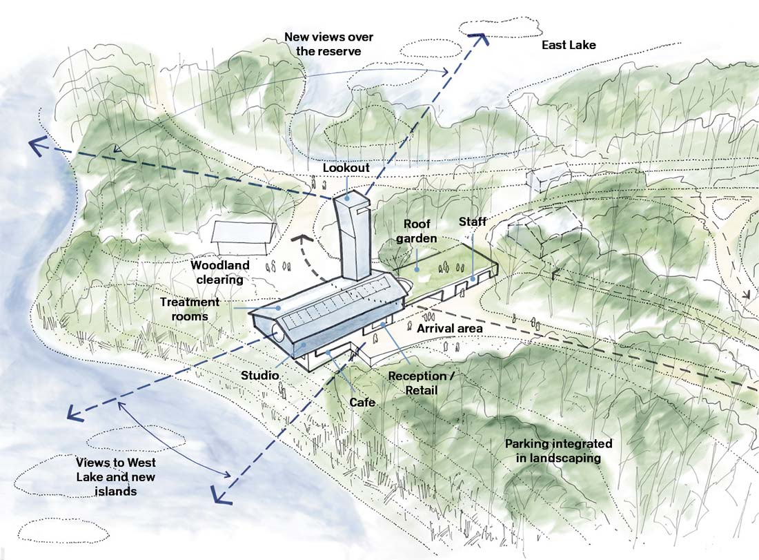 Our design draws inspiration from the site, with structures cloaked in planting, bird-watching hides perched on the edges of lakes, and references to its industrial history. The proposal is a striking composition of three distinct elements: the ground-level visitor centre and offices; the timber-framed raised studio and treatment rooms; and a filigree timber treetop lookout platform.