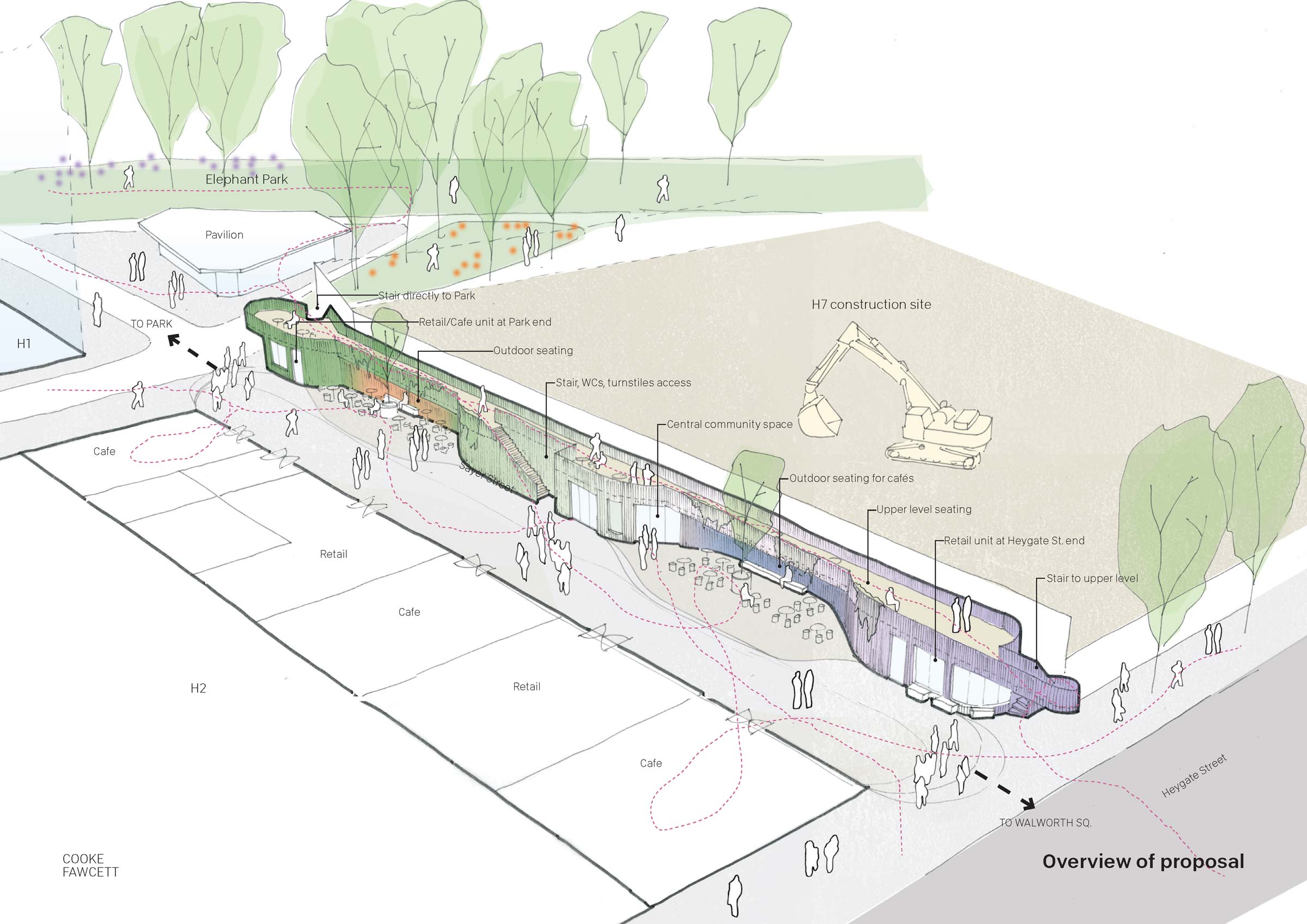 Opposite this, the hoarding line of the final plot to be developed is an opportunity to provide public space for 5-7 years. Our proposal creates outdoor seating, small shop units at both ends, and a community-use space at the centre. An upper level deck is accessed directly from the park, offering additional seating areas and an exciting raised journey with views of the building site behind.