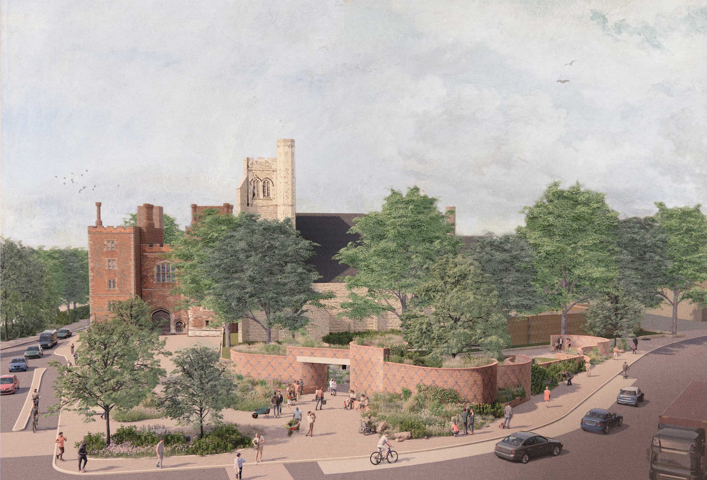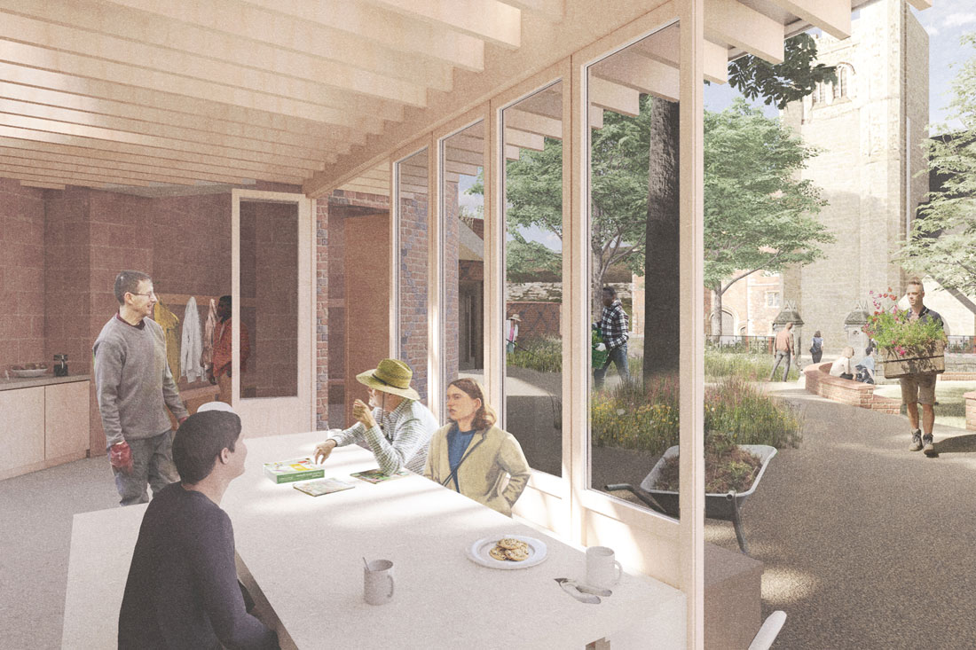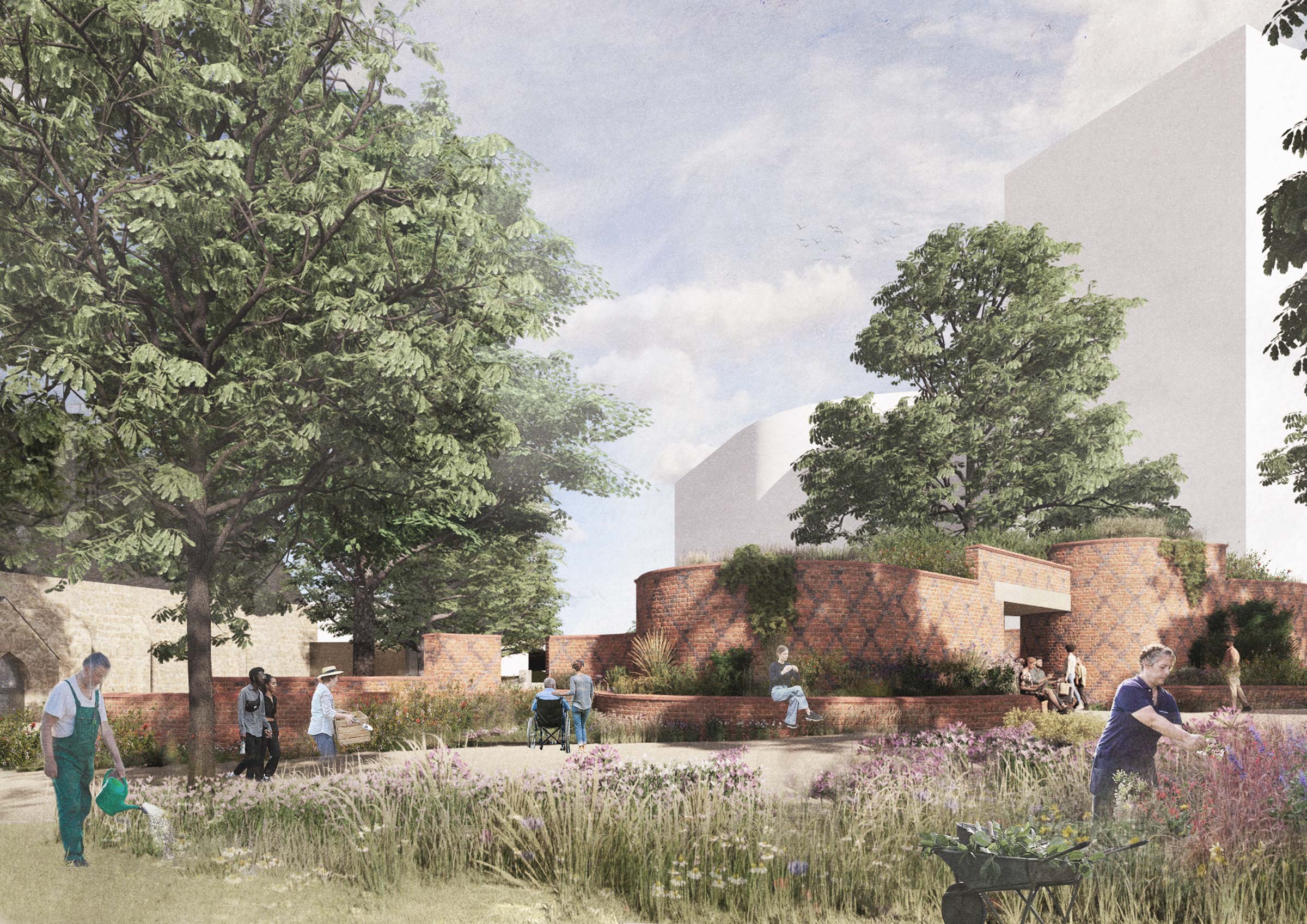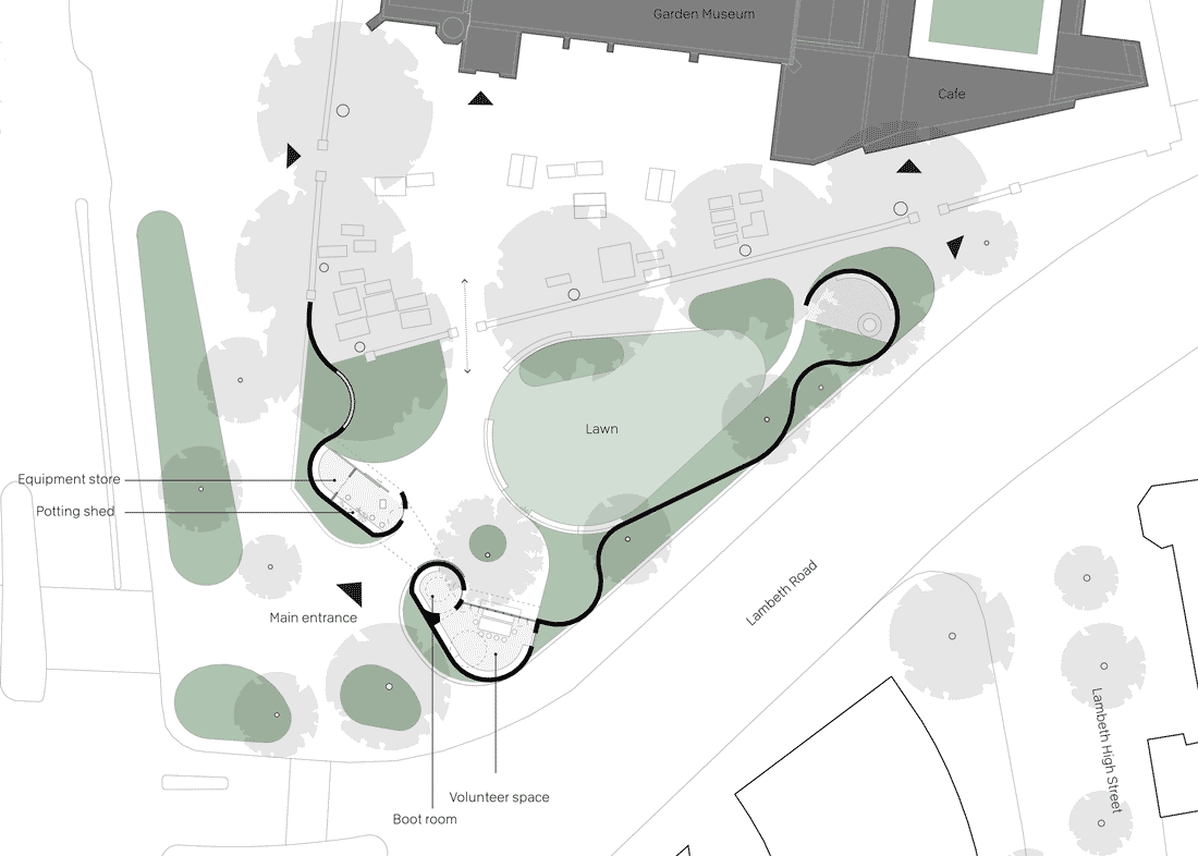 Proposal for a permanent small pavilion and curved walled garden at the entrance to The Garden Museum, Lambeth. Our proposal was runner-up in the open competition which attracted 128 submissions. The brief: to design a pavilion to act as a new entrance to Lambeth Green, as well as a base for horticultural staff and volunteers, with a new green public realm to be created around the Museum to the designs of Dan Pearson Studio.
