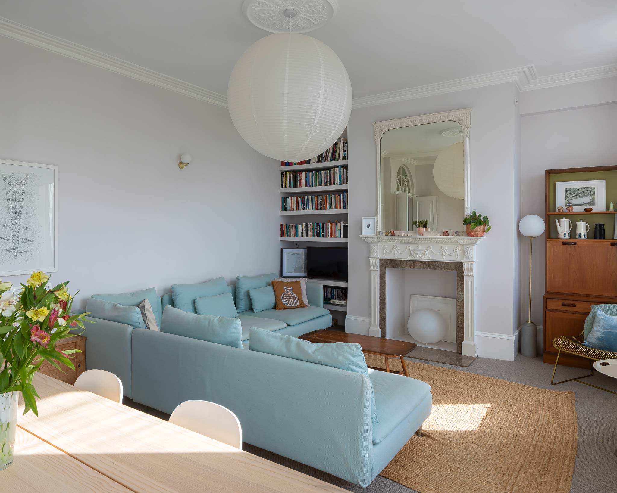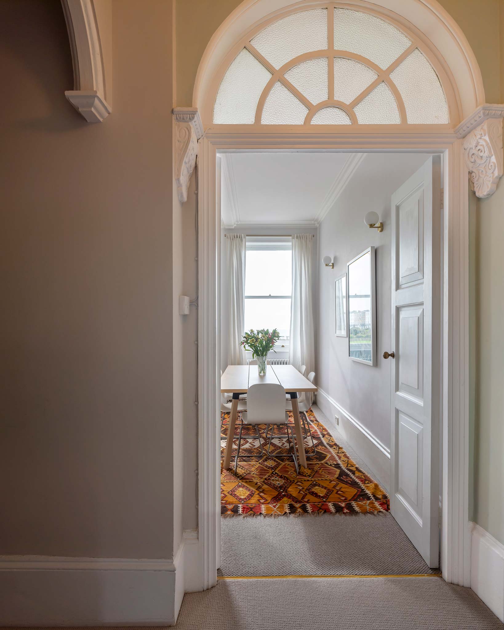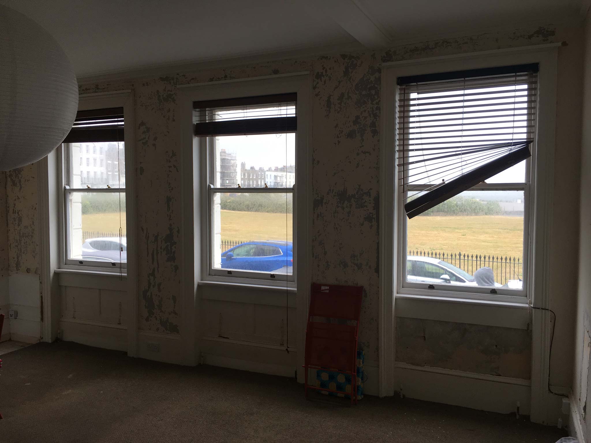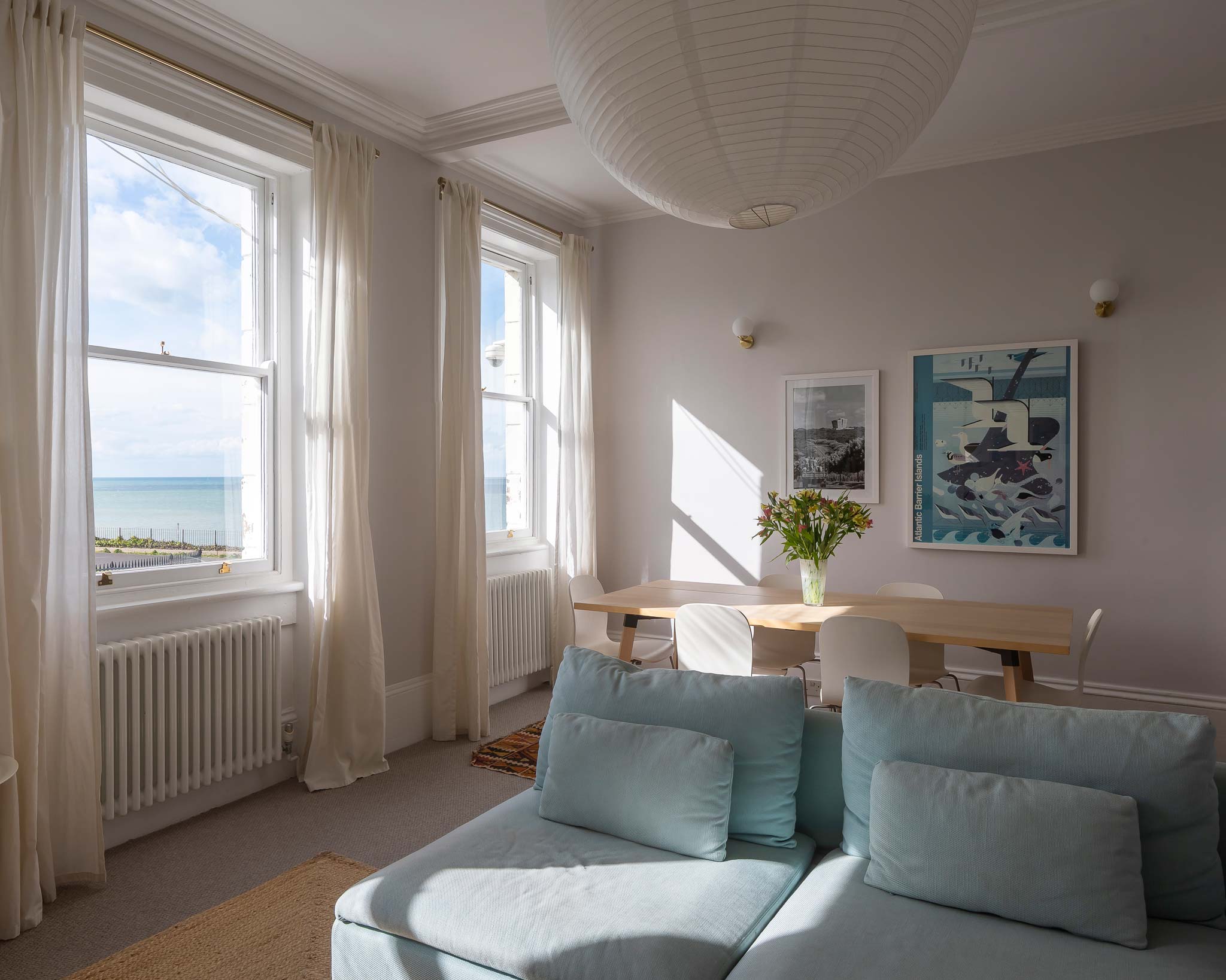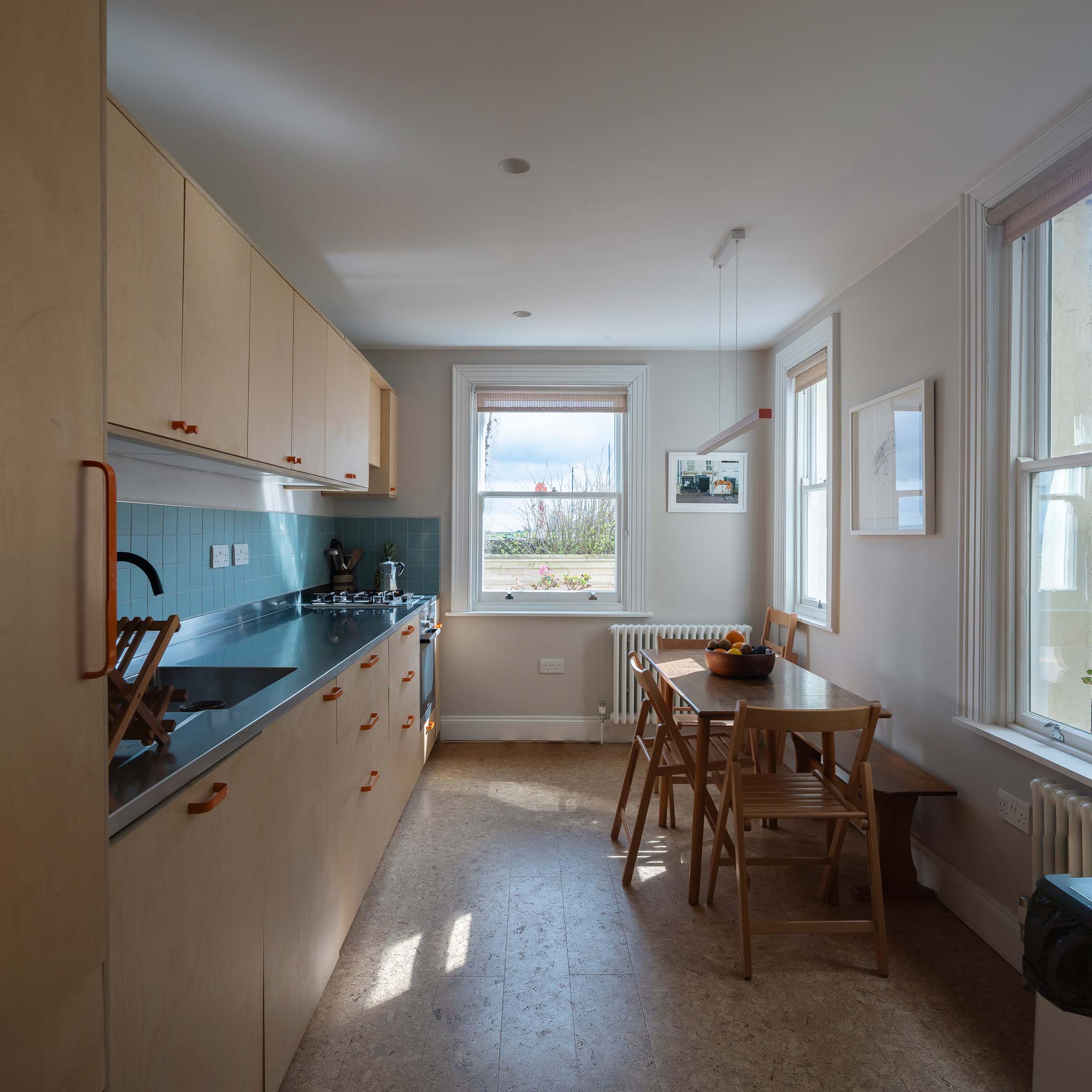 Full refurbishment and reconfiguration of a flat in a beachside Grade II listed block. The kitchen was relocated to the east to enjoy views along the waterfront and morning light, swapping places with bathrooms. The west-facing living room has incredible summer sunsets. The block was originally terraced houses, but in c. 1870s became various hotels and the internal layout was totally changed, with a corridor punched down the middle and a number of original front doors turned into windows. As a result the flats in the building all have very unusual layouts, with no two flats the same.