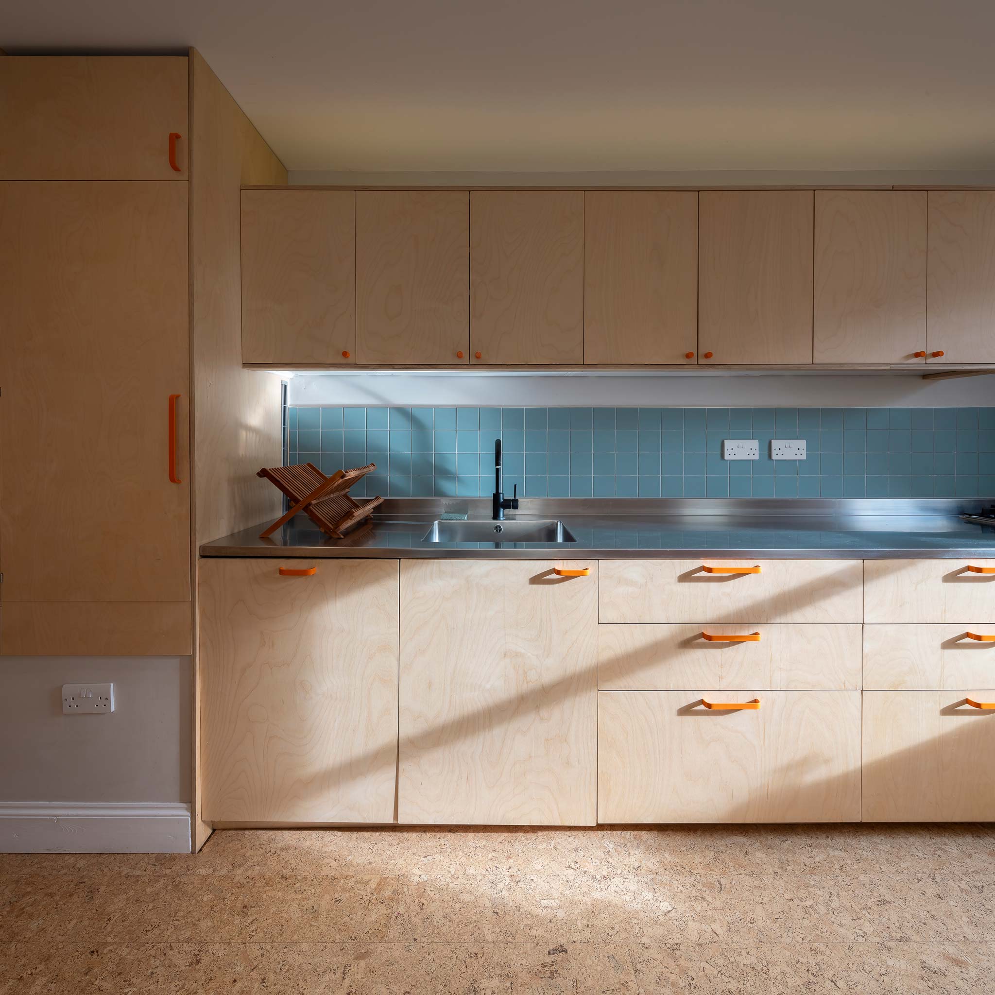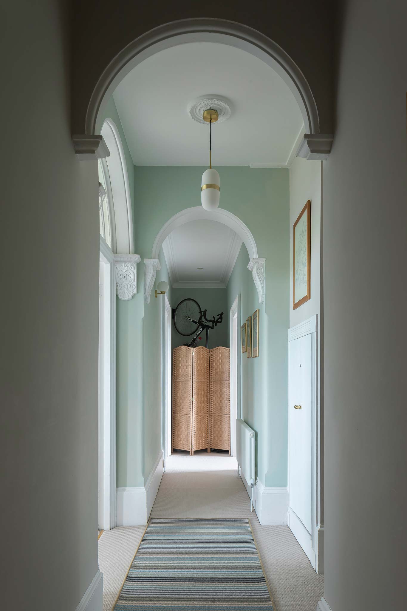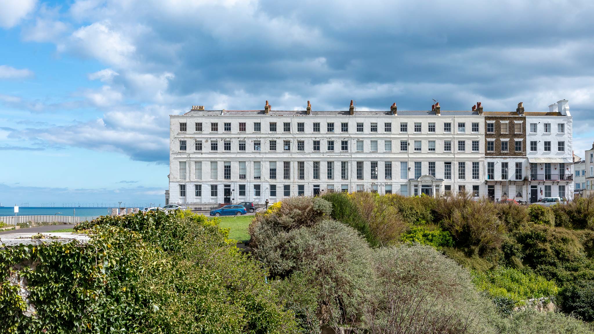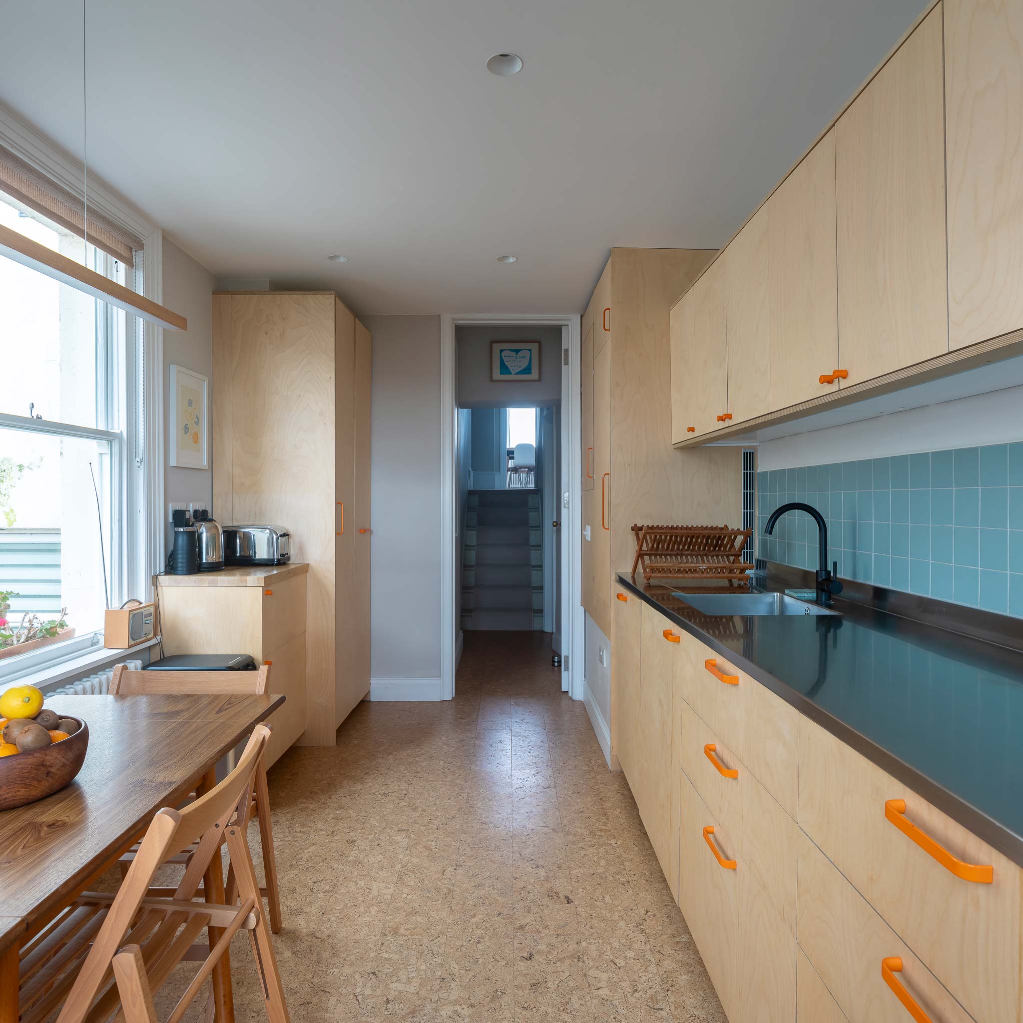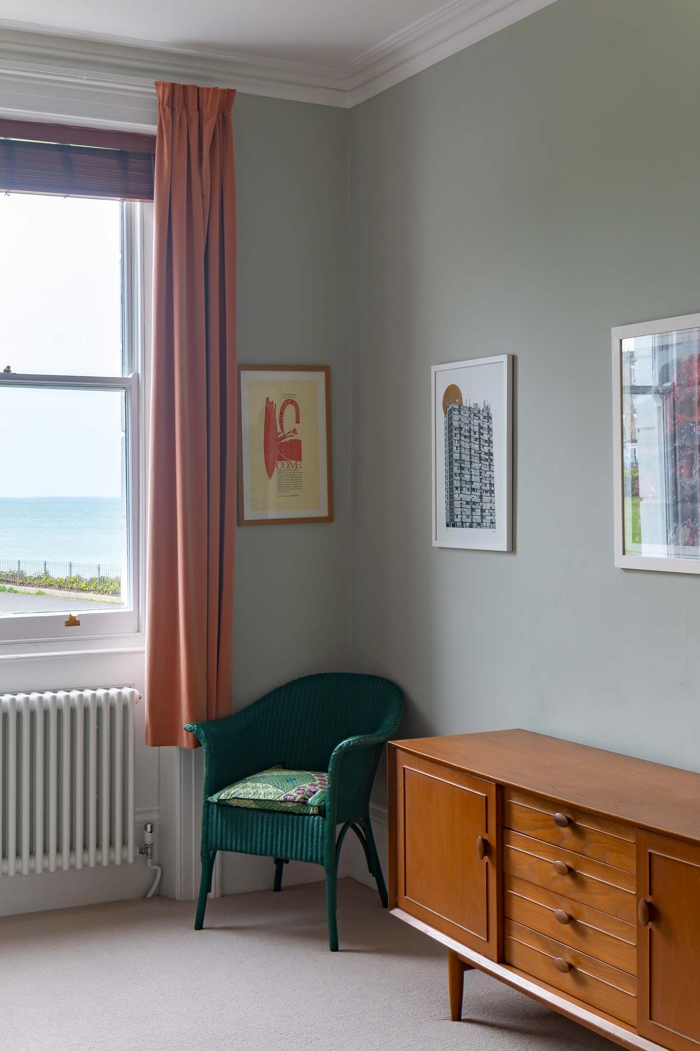 Full refurbishment and reconfiguration of a flat in a beachside Grade II listed block. The kitchen was relocated to the east to enjoy views along the waterfront and morning light, swapping places with bathrooms. The west-facing living room has incredible summer sunsets. The block was originally terraced houses, but in c. 1870s became various hotels and the internal layout was totally changed, with a corridor punched down the middle and a number of original front doors turned into windows. As a result the flats in the building all have very unusual layouts, with no two flats the same.