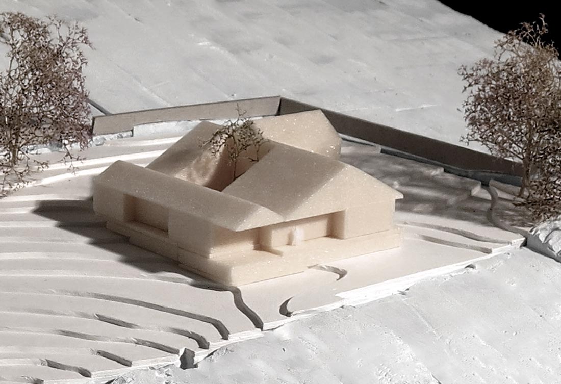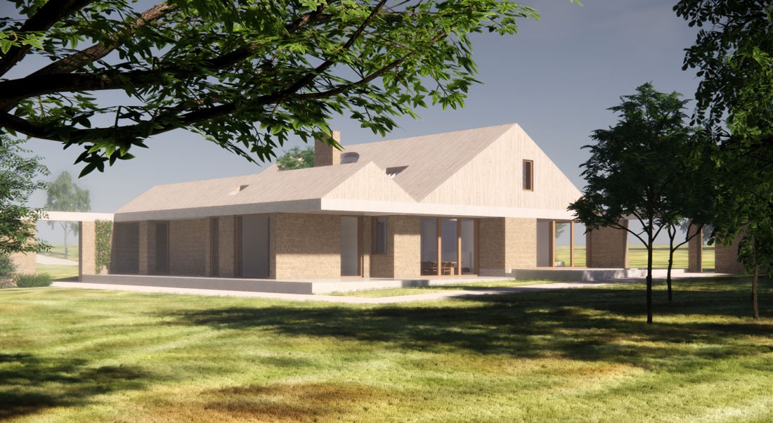 Designed around a glazed wind-sheltered internal courtyard, the house has plentiful windows offering views from its elevated position out across the fields. Our proposal fulfils the client’s desire for the building to offer a variety of experiences of the surrounding landscape – both intimate and expansive.